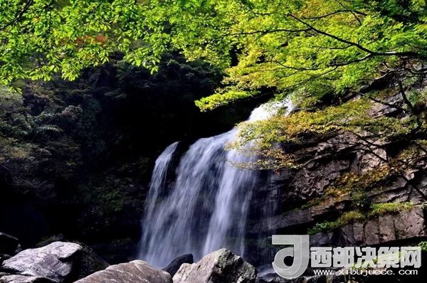 與浪漫相遇一座楓林吊橋,幽幽千古一段花橋路,瀑布在那頭,花橋在這里。從楓林橋走上去,一條瀑布掛在石壁之間,漂亮極了!