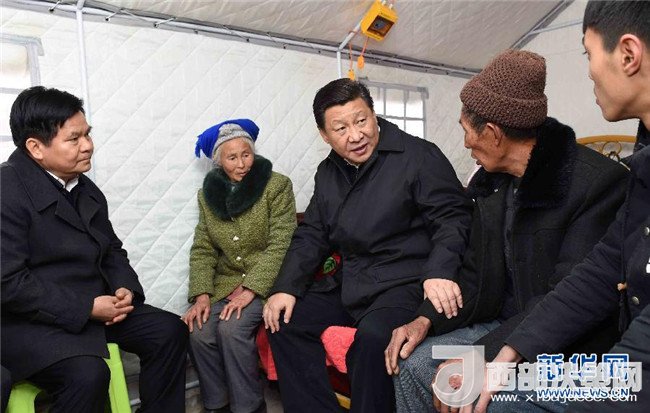 2015年1月19日至21日,中共中央總書記、國家主席、中央軍委主席習(xí)近平來到云南昭通、大理、昆明等地,看望魯?shù)榈卣馂?zāi)區(qū)干部群眾,深入企業(yè)、工地、鄉(xiāng)村考察,就災(zāi)后恢復(fù)重建和經(jīng)濟(jì)社會(huì)發(fā)展情況進(jìn)行調(diào)研。這是1月19日,習(xí)近平來到魯?shù)榭h小寨鎮(zhèn)甘家寨紅旗社區(qū)過渡安置點(diǎn),走進(jìn)鄒體富老兩口和孫子住的帳篷,詢問家里吃飯、補(bǔ)助、收入等問題。新華社記者 張鐸 攝