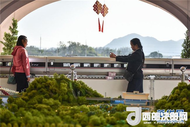 在泰國(guó)東北部呵叻府巴沖縣,參觀者在中泰鐵路合作項(xiàng)目一期工程開(kāi)工儀式上與展出的中國(guó)復(fù)興號(hào)高鐵列車(chē)模型合影(2017年12月21日攝)。新華社記者 李芒茫 攝