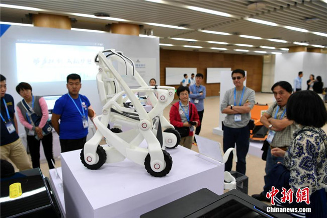10月13日,第四屆中國“互聯(lián)網(wǎng)+”大學(xué)生創(chuàng)新創(chuàng)業(yè)大賽總決賽在廈門大學(xué)舉行。無人機(jī)、自助售飯機(jī)、人偶互動(dòng)、全息3D智能視頻、機(jī)器人輪椅、3D打印假肢手臂等大學(xué)生研發(fā)設(shè)計(jì)的產(chǎn)品亮相會(huì)場,以“90后”為主的創(chuàng)新創(chuàng)業(yè)生力軍已全面發(fā)力,釋放出“青年+創(chuàng)新創(chuàng)業(yè)”的無窮力量。圖為3D打印個(gè)性化定制機(jī)器人輪椅展示。中新社記者 王東明 攝