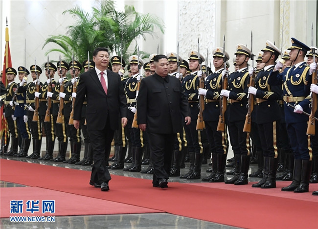 1月8日,中共中央總書記、國家主席習近平同當日抵京的朝鮮勞動黨委員長、國務(wù)委員會委員長金正恩舉行會談。會談前,習近平在人民大會堂北大廳為金正恩舉行歡迎儀式。 新華社記者 李學仁 攝