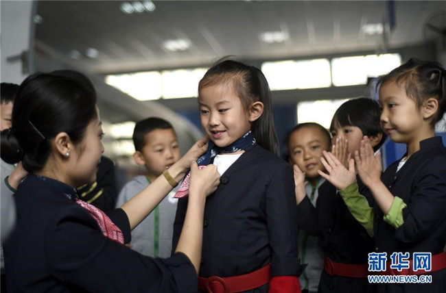 當日,蘭州惠智博仁幼兒園的小朋友在東航甘肅分公司空乘人員的陪伴下來到蘭州文理學院,體驗客艙安全檢查、服務禮儀示范等內容,迎接即將到來的“六一”兒童節(jié)。新華社記者 王朋 攝