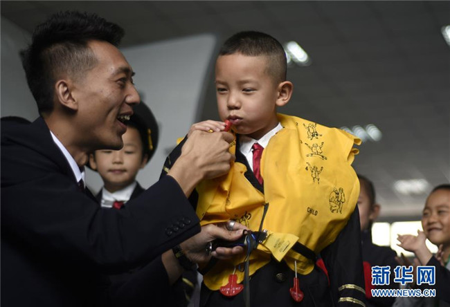 5月27日,在蘭州文理學院航空模擬訓練艙,空乘人員引導小朋友體驗救生衣使用方法。