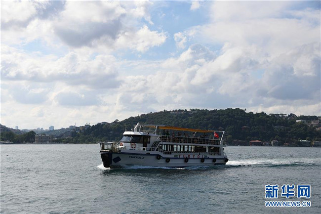 7月18日,在土耳其伊斯坦布爾,一艘游船在博斯普魯斯海峽航行。新華社記者 徐速繪 攝