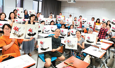 圖為教師們在展示國畫作品。北京外國語大學(xué)供圖