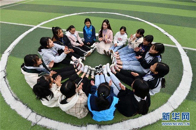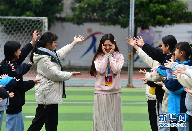 12月5日,在廣西融水苗族自治縣?;钢袑W(xué),林洋港(右三)和學(xué)生們在球場上玩游戲。林洋港是西北工業(yè)大學(xué)的在讀碩士研究生,今年9月來到融水苗族自治縣保桓中學(xué)任物理老師。新華社記者 黃孝邦 攝