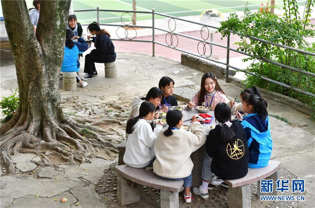 12月5日,在廣西融水苗族自治縣保桓中學(xué),林洋港(正面,右一)和學(xué)生們在校園里吃午飯。林洋港是西北工業(yè)大學(xué)的在讀碩士研究生,今年9月來到融水苗族自治縣保桓中學(xué)任物理老師。 新華社記者 黃孝邦 攝
