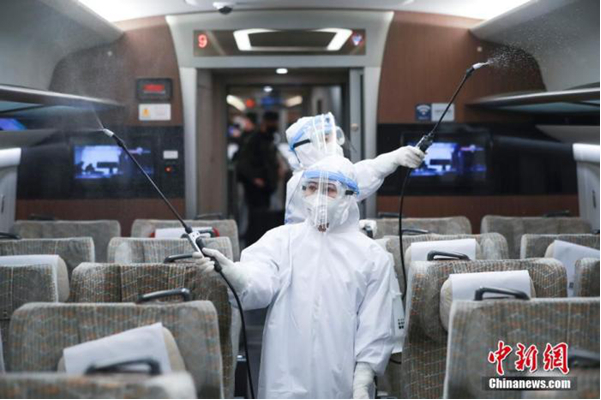 資料圖:工作人員在一輛高鐵車廂內(nèi)執(zhí)行消毒任務(wù)。中新社記者 賈天勇 攝