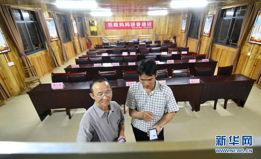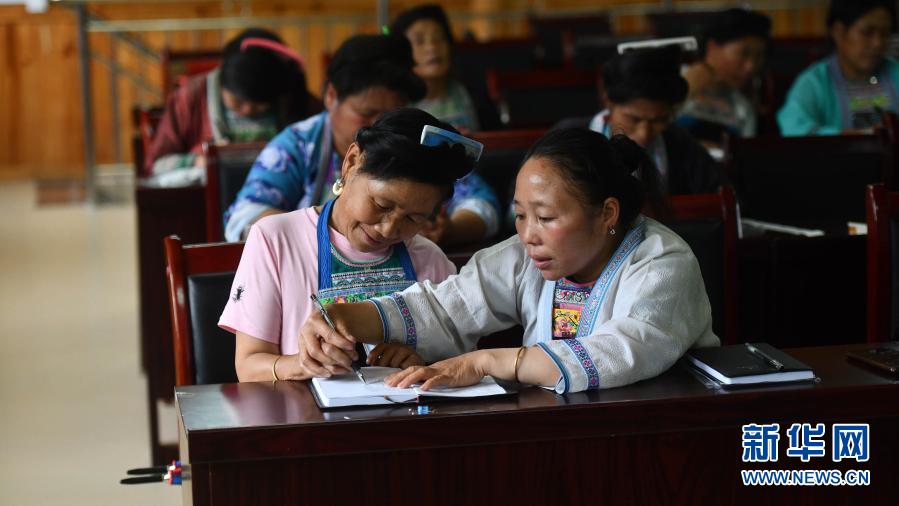 在烏英苗寨,黨鳩村村委會(huì)副主任梁秀平(右)在研究“雙語雙向”培訓(xùn)班的課堂內(nèi)容(6月18日攝)。新華社記者 黃孝邦 攝