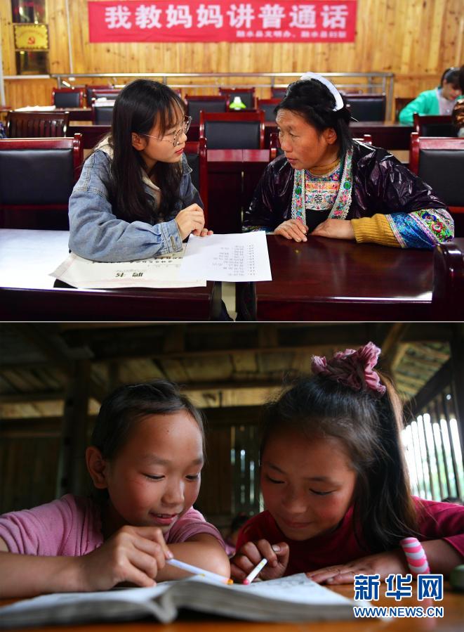 這是一張拼版照片,上圖為:2020年4月1日,在烏英苗寨“雙語雙向”培訓(xùn)班課堂上,大一學(xué)生潘木枝(左)在教媽媽講普通話(新華社記者黃孝邦攝);下圖為:2010年5月27日,在烏英教學(xué)點(diǎn),二年級(jí)學(xué)生潘木枝(左)在課堂上學(xué)習(xí)(龍濤攝)。新華社發(fā)