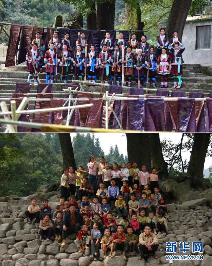 這是一張拼版照片,上圖為:2020年10月25日,烏英苗寨“雙語雙向”培訓(xùn)班的同學(xué)們?cè)诠艠湎潞嫌埃ㄐ氯A社記者黃孝邦攝);下圖為:2006年9月19日,烏英苗寨教學(xué)點(diǎn)的師生們?cè)诠艠湎潞嫌埃垵龜z)。新華社發(fā)