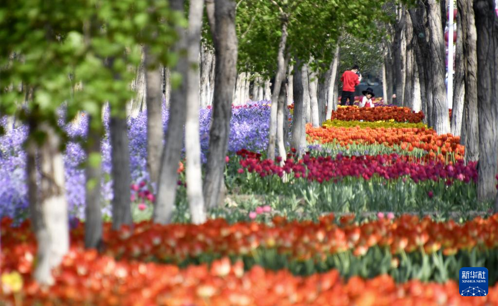 4月19日,游人在北臧村鎮(zhèn)永定河畔的綠色港灣內(nèi)拍攝盛開的郁金香。
