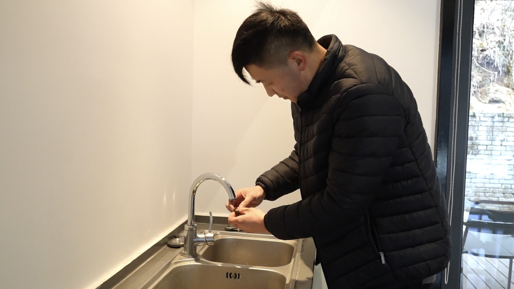 張飛在民宿房間內(nèi)維修堵塞的水龍頭