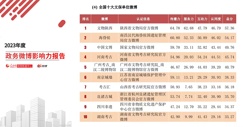 日前,人民網(wǎng)輿情數(shù)據(jù)中心聯(lián)合新浪微博發(fā)布“2023年度政務(wù)微博影響力報告”,并公布政務(wù)微博榜單,陜西省文物局官方微博“文物陜西”再次榮登“全國十大文保單位微博”榜首,并連續(xù)11年獲此殊榮。