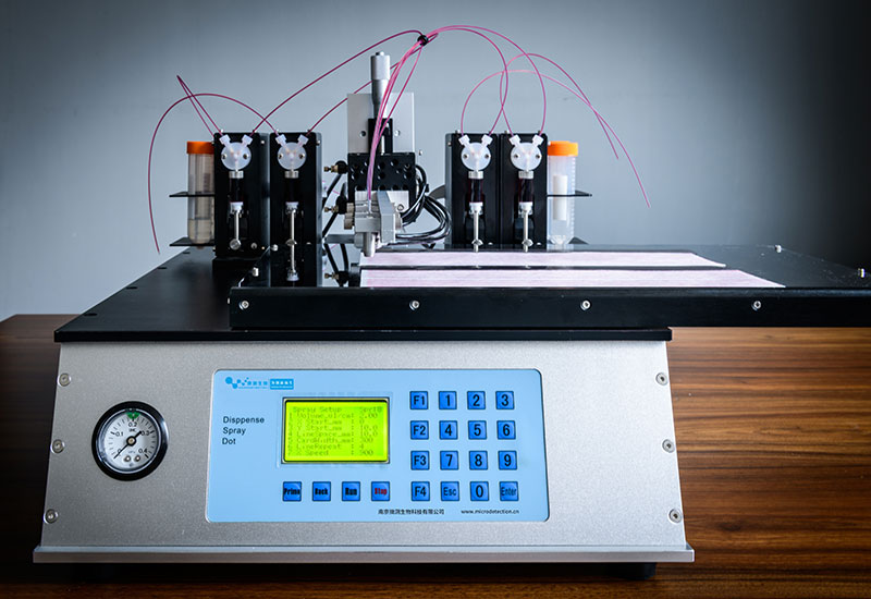 大平臺多通道噴金標機應用于生產(chǎn)過程中均勻地把膠體金,熒光微球,量子點等顆粒均勻地噴在聚酯膜,玻纖等材料上。相比于傳統(tǒng)的噴金機,效率大大提高,是特大型企業(yè)必備的生產(chǎn)設備之一。